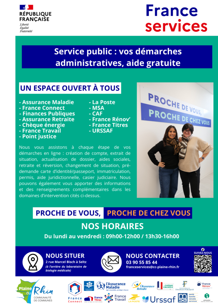 Le territoire dispose d’un espace 𝐅𝐫𝐚𝐧𝐜𝐞 𝐒𝐞𝐫𝐯𝐢𝐜𝐞𝐬, situé à 𝐒𝐞𝐥𝐭𝐳, au 𝟐 𝐫𝐮𝐞 𝐌𝐚𝐫𝐜𝐞𝐥 𝐁𝐢𝐬𝐜𝐡 (à l’arrière du laboratoire de biologie Médiacel).