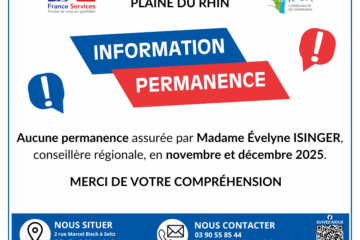 📢 𝐅𝐑𝐀𝐍𝐂𝐄 𝐒𝐄𝐑𝐕𝐈𝐂𝐄𝐒 – 𝐈𝐍𝐅𝐎𝐑𝐌𝐀𝐓𝐈𝐎𝐍 𝐏𝐄𝐑𝐌𝐀𝐍𝐄𝐍𝐂𝐄 Durant les mois de novembre et décembre 2025, il n’y aura 𝐩𝐚𝐬 𝐝𝐞 𝐩𝐞𝐫𝐦𝐚𝐧𝐞𝐧𝐜𝐞 de votre conseillère régionale, Madame Évelyne Isinger, au France Services Plaine du Rhin à Seltz. 🙏 Merci de votre compréhension.