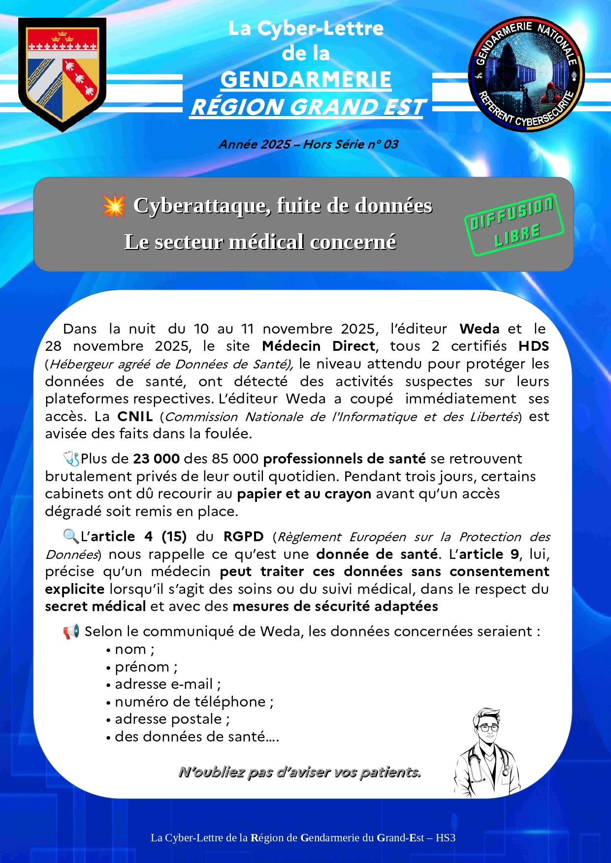 – Cyberattaque, fuite de données « Le secteur médical concerné » (lettre Cyber RGGE HS03)