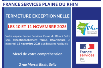 Le bureau France Services à Seltz sera exceptionnellement fermé le jeudi 13 avril 2023 de 9h à 16h30 pour cause de formation.