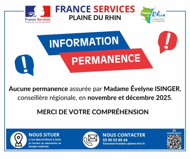📢 𝐅𝐑𝐀𝐍𝐂𝐄 𝐒𝐄𝐑𝐕𝐈𝐂𝐄𝐒 – 𝐈𝐍𝐅𝐎𝐑𝐌𝐀𝐓𝐈𝐎𝐍 𝐏𝐄𝐑𝐌𝐀𝐍𝐄𝐍𝐂𝐄 Durant les mois de novembre et décembre 2025, il n’y aura 𝐩𝐚𝐬 𝐝𝐞 𝐩𝐞𝐫𝐦𝐚𝐧𝐞𝐧𝐜𝐞 de votre conseillère régionale, Madame Évelyne Isinger, au France Services …