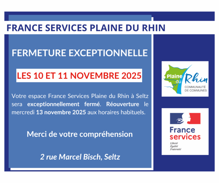🔒 𝐅𝐄𝐑𝐌𝐄𝐓𝐔𝐑𝐄𝐒 𝐄𝐗𝐂𝐄𝐏𝐓𝐈𝐎𝐍𝐍𝐄𝐋𝐋𝐄𝐒 – 𝟏𝟎 & 𝟏𝟏 𝐍𝐎𝐕𝐄𝐌𝐁𝐑𝐄 𝟐𝟎𝟐𝟓 Votre espaces France Services Plaine du Rhin à Seltz, sera 𝐞𝐱𝐜𝐞𝐩𝐭𝐢𝐨𝐧𝐧𝐞𝐥𝐥𝐞𝐦𝐞𝐧𝐭 fermé 𝐥𝐞𝐬 𝐥𝐮𝐧𝐝𝐢 𝟏𝟎 𝐞𝐭 𝐦𝐚𝐫𝐝𝐢 𝟏𝟏 𝐧𝐨𝐯𝐞𝐦𝐛𝐫𝐞 𝟐𝟎𝟐𝟓. 🕓 …