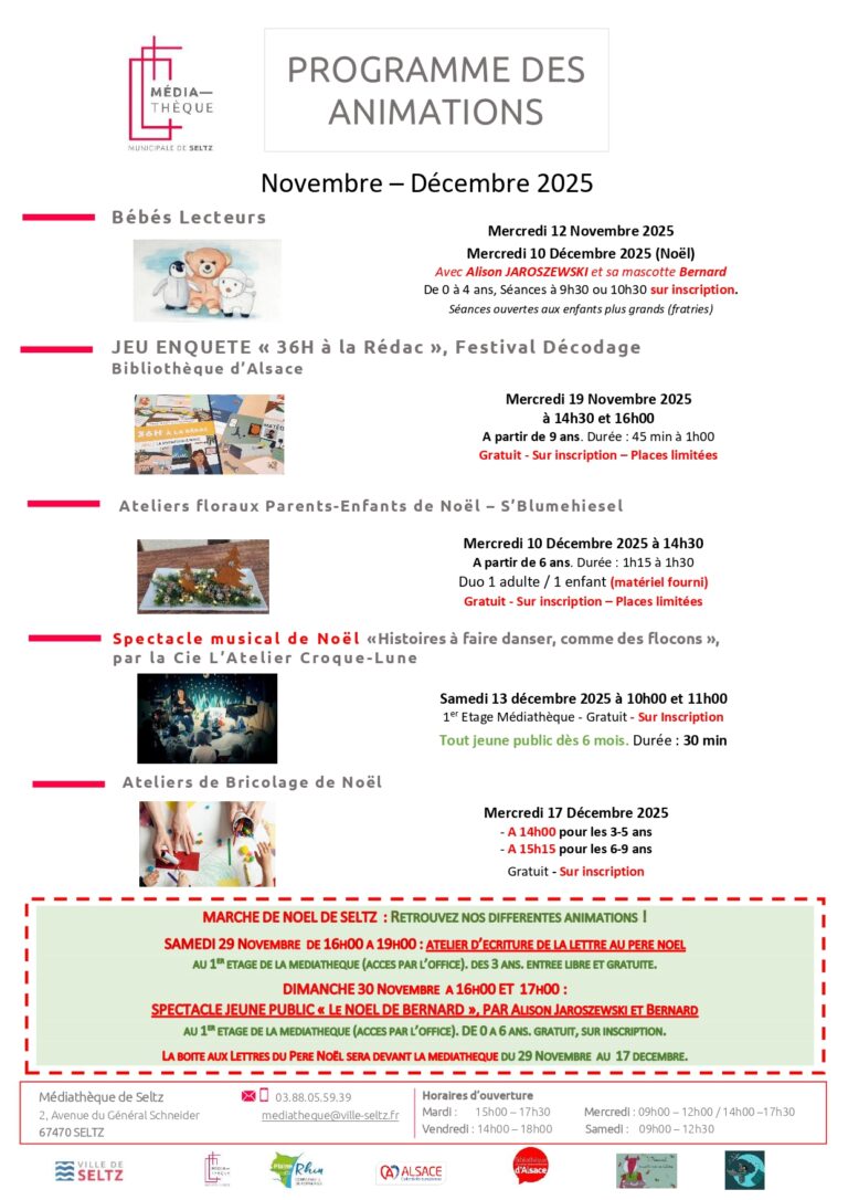 📚 MÉDIATHÈQUE DE SELTZ – ANIMATIONS NOV./DÉC. 2025 🔎 Jeu d’enquête « 36H à la Rédac »📅 𝟏𝟗 𝐧𝐨𝐯. – 𝟏𝟒𝐡𝟑𝟎 & 𝟏𝟔𝐡𝟎𝟎 • dès 9 ans • ⏳ 45 …