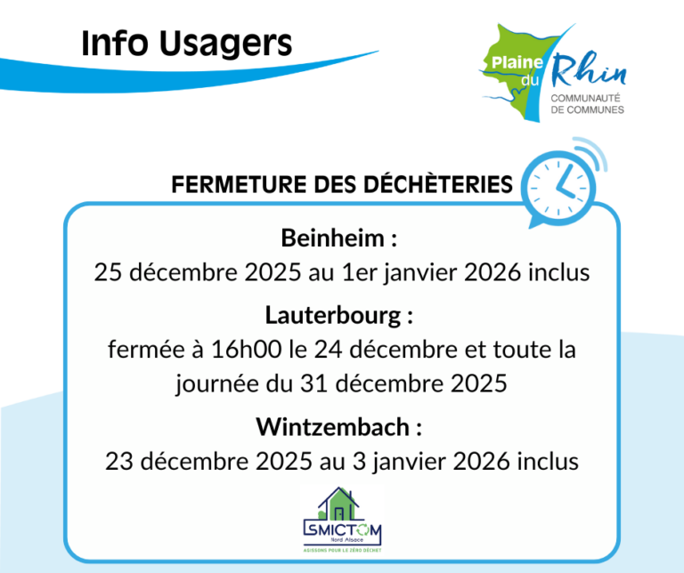 ♻️ SMICTOM NORD ALSACE – Fermeture des déchèteries 📢 𝐕𝐞𝐮𝐢𝐥𝐥𝐞𝐳 𝐩𝐫𝐞𝐧𝐝𝐫𝐞 𝐧𝐨𝐭𝐞 des dates de fermeture des déchèteries : 🙏 Merci pour votre compréhension.📞 Pour toute demande, veuillez contacter directement …