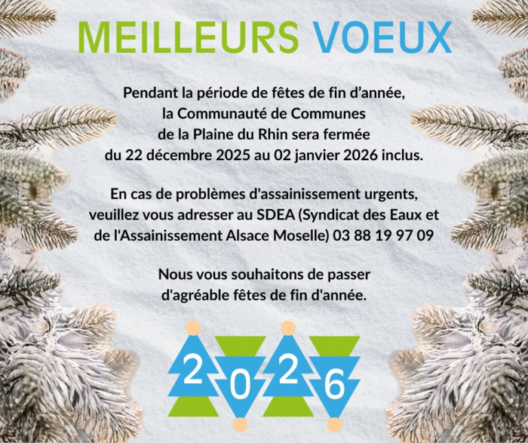 𝐅𝐄𝐑𝐌𝐄𝐓𝐔𝐑𝐄 𝐃𝐄 𝐅𝐈𝐍 𝐃’𝐀𝐍𝐍𝐄́𝐄 Pendant la période des fêtes de fin d’année, la Communauté de Communes de la Plaine du Rhin sera fermée du 𝟐𝟐 𝐝𝐞́𝐜𝐞𝐦𝐛𝐫𝐞 𝟐𝟎𝟐𝟓 𝐚𝐮 𝟐 𝐣𝐚𝐧𝐯𝐢𝐞𝐫 …