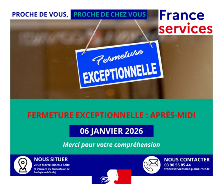 𝐅𝐫𝐚𝐧𝐜𝐞 𝐒𝐞𝐫𝐯𝐢𝐜𝐞𝐬 𝐏𝐥𝐚𝐢𝐧𝐞 𝐝𝐮 𝐑𝐡𝐢𝐧 𝐚̀ 𝐒𝐞𝐥𝐭𝐳 Sera 𝐞𝐱𝐜𝐞𝐩𝐭𝐢𝐨𝐧𝐧𝐞𝐥𝐥𝐞𝐦𝐞𝐧𝐭 𝐟𝐞𝐫𝐦𝐞́ l’après-midi du 𝟎𝟔 𝐣𝐚𝐧𝐯𝐢𝐞𝐫 𝟐𝟎𝟐𝟔. Nous vous remercions par avance pour votre compréhension