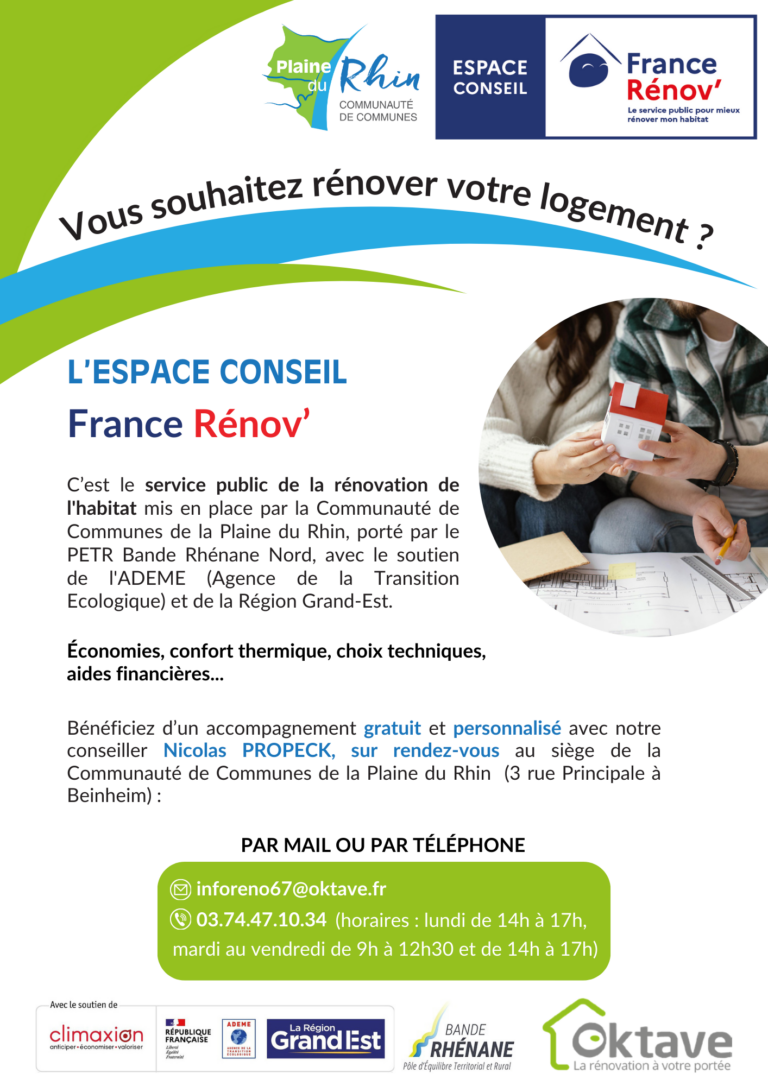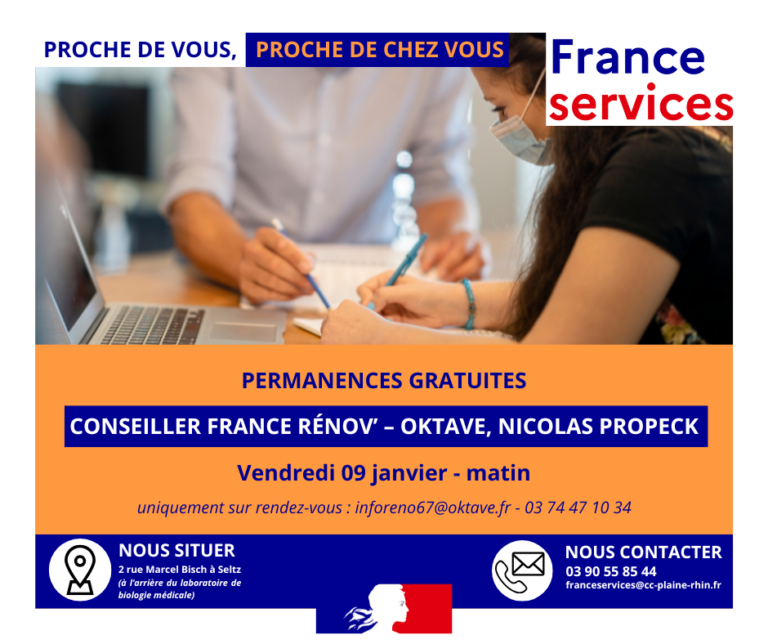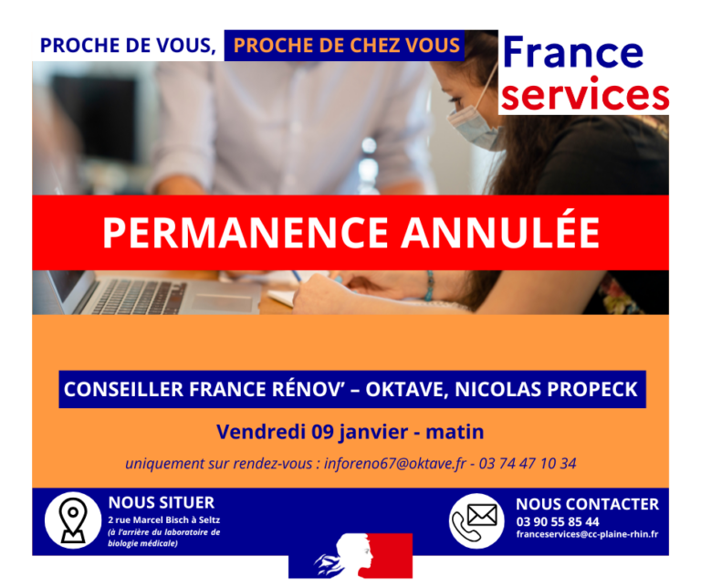 La permanence du conseiller France Rénov’ / Oktave, prévue le vendredi 9 janvier 2026 à France Services Plaine du Rhin à Seltz, est annulée. Merci pour votre compréhension.