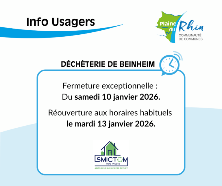 🚫 La déchèterie de 𝐁𝐞𝐢𝐧𝐡𝐞𝐢𝐦 sera fermée du 𝐦𝐚𝐫𝐝𝐢 𝟏𝟑 𝐣𝐚𝐧𝐯𝐢𝐞𝐫 𝐚𝐮 𝐬𝐚𝐦𝐞𝐝𝐢 𝟏𝟕 𝐣𝐚𝐧𝐯𝐢𝐞𝐫 𝟐𝟎𝟐𝟔 𝐢𝐧𝐜𝐥𝐮𝐬. 📅 Réouverture : 𝐦𝐚𝐫𝐝𝐢 𝟐𝟎 𝐣𝐚𝐧𝐯𝐢𝐞𝐫 𝟐𝟎𝟐𝟔, 𝐚𝐮𝐱 𝐡𝐨𝐫𝐚𝐢𝐫𝐞𝐬 𝐡𝐚𝐛𝐢𝐭𝐮𝐞𝐥𝐬.