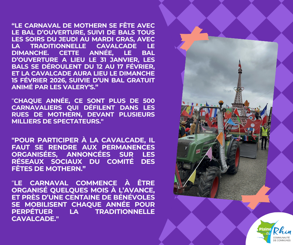 Découvrez en détails les 𝐭𝐫𝐚𝐝𝐢𝐭𝐢𝐨𝐧𝐬 𝐝𝐮 𝐜𝐚𝐫𝐧𝐚𝐯𝐚𝐥 qui ont lieu sur notre territoire. Aujourd’hui, nous vous présentons le Comité des Fêtes de Mothern et leur 𝐜𝐚𝐯𝐚𝐥𝐜𝐚𝐝𝐞![]()