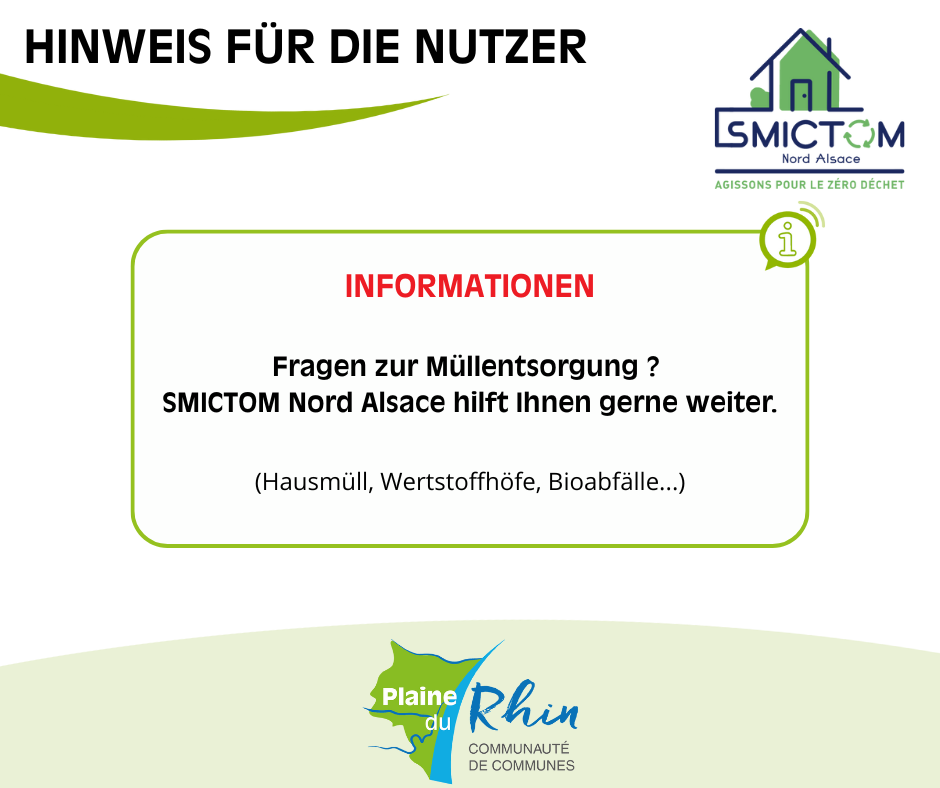 Seit dem 1. Januar 2024 ist der SMICTOM Nord Alsace Ihr alleiniger Ansprechpartner für alle Anliegen rund um die Abfallentsorgung (Hausmüll, Wertstoffhöfe, Bioabfäll…).